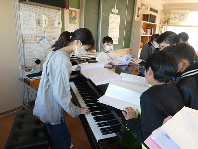 パートに分かれて、音程の確認をしました。さすが6年生、ピアノやキーボードを使って自分たちで音取りをしていきます。まだ自信がなさそうにしている人もいますが、1時間でだいぶ声がでるようになってきました。