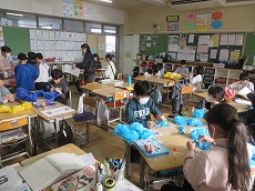 学校、下学年の友だち、先生への感謝の気持ちを込めて、配膳台カバーと雑巾を作っています。「せっかく贈るものだからきれいに作りたいよね!」と、グループで協力して作業を進めていました。