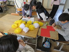別の教室では、飾り付けのための紙花をたくさん作っていました。