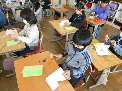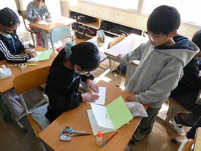切ったり貼ったり、3年生には少し複雑な内容だったので、苦労しながら作っていました。お花がいっぱい飾ってある、すてきな招待状に仕上がる予定です。気持ちを込めて作ることができました。