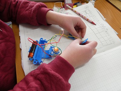自分たちで持ち寄った物が、電気を通すのか通さないのか調べる実験をしました。子どもたちが使っている実験キットは、電気が通ると豆電球に明かりがつくようになっています。自分で持ってきた物を調べ終えた子たちは、教室中の物を調べていました。