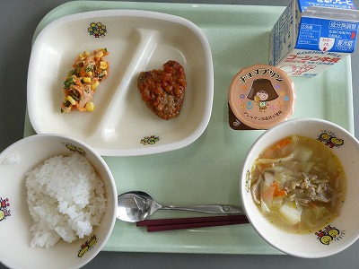メニューはご飯、コンソメスープ、ハートハンバーグトマトソース、人参サラダ、チョコプリンでした。ハートハンバーグやチョコプリンは争奪戦でした。「今日は帰ったらチョコを作るんだ!」という子もちらほら。すてきな週末になると良いですね。
