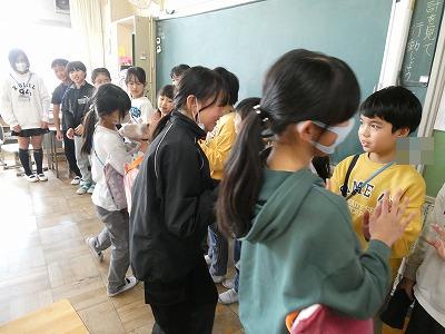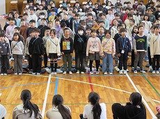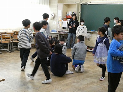 拍手の中教室に入ってきた6年生。いつもとは異なり、迎えてもらう立場に少し照れながらの入場でした。5年生が計画したレクで楽しく遊び、最後には6年生へ感謝の気持ちを伝えて活動が終わりました。