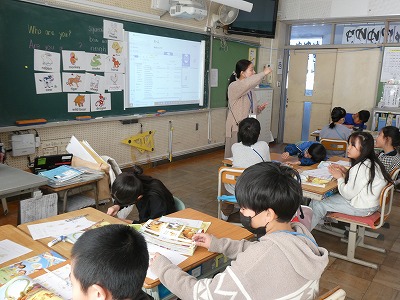 「Who are you?」の学習をしています。十二支に出てくる動物を英語で発音したり、体を動かしながら歌を歌ったりしました。