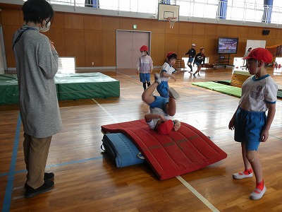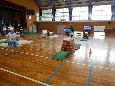 開脚跳びや台上前転など、自分で選択して練習をしていました。跳び箱が苦手な児童は、先生と一緒に、マットを敷いたところで練習です。自信をつけてから跳び箱へ進んでいくようです。