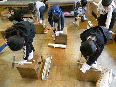 事前学習で学んだ通り、上手にのこぎりを使って木材を切ることができました。切り終えた児童は、木を積み上げたり並べたりしてどのような作品にしようか考えました。生きものやお城など、素敵な作品ができあがりそうです。