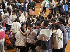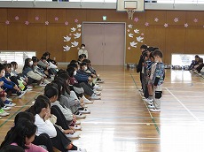 1年生から手紙のプレゼント。2年生から栞のプレゼント。こうして始まった6年生を送る会。途中、「もうじゅうがりゲーム」で全校児童が交流し、とても良い雰囲気になりました。