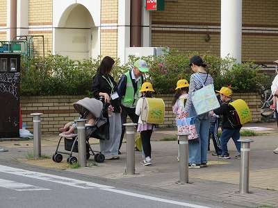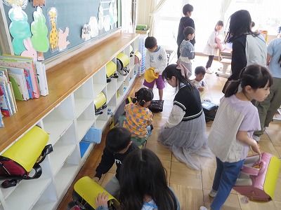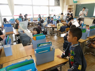 ボランティアの方や先生、保護者の方に見守られながら、安全に登校することができました。1年生教室では、6年生が朝の支度を手伝う姿が見られました。