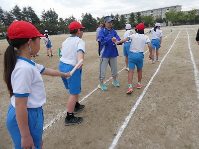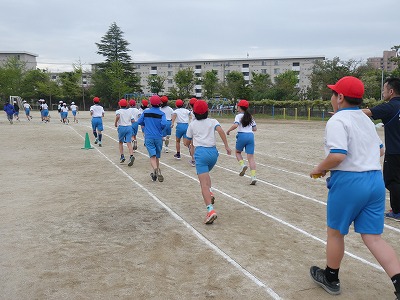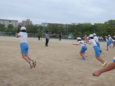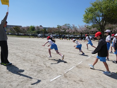 とても気持ちの良い天気の中、高学年は100メートル走のタイムを測りました。