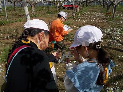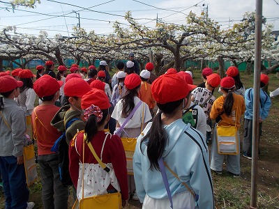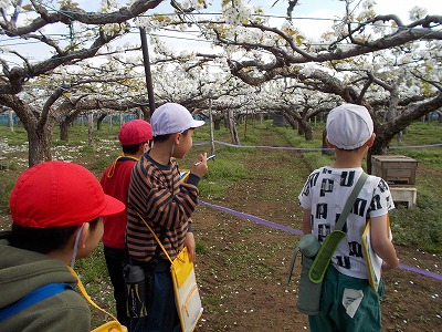 農家の方から梨作りについてのお話をきき、実際に今咲いている花の様子を見させていただきました。これから、おいしい梨になるまでの過程を見ていくのが楽しみですね。