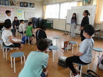 「小さな世界」を歌ったり、歌に合わせて手合わせをしたりしました。2つのパートに分かれ、友達と声を合わせて歌う学習もしました。その歌声を前でリーダーが聞き、リズムが合っているか、歌声の大きさのバランスはどうか、などを確認しました。みんなで意見を出し合いながら、よりよい歌声になるよう練習に取り組みました。