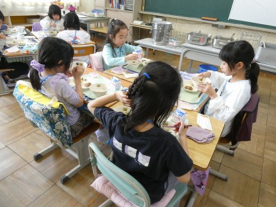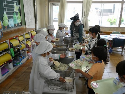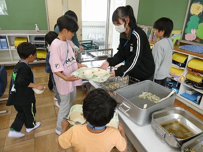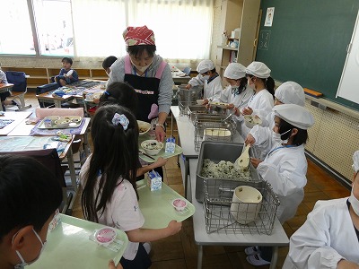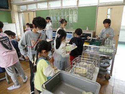 給食当番は白衣に着替え、上手に配膳をすることができました。片付けのときには6年生が手伝いに来てくれて、やり方を教えてくれました。少しずつできることが増えていきますね。