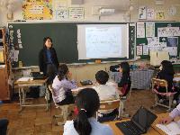 2年生は、児童館や消防署、スーパーマーケット、いすゞ自動車、給食センターなどそれぞれが体験してきた場所について、タブレットでスライドをまとめ、原稿を書いて1年生に発表していました。