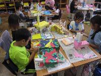 1年生は箱を使っていろいろな動物をかたどり、そこにさまざまな色紙を貼って表現しています。