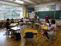 4年生は、外国語の授業です。みんな元気よく手を挙げていますが、これは「今出し合ったクイズで1問も当たらなかった人!」という場面です。英語はきちんと話せていましたが、クイズに当たる当たらないは、別の能力のようです。でも、みんな楽しそうに手を挙げていました。さあ、次のクイズではがんばってね!