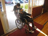 車椅子体験では、基本的な介助方法を教わった後に、ペアを組んでそれぞれの役割を体験をしましたが、段差を越えるときに持ち上げられなかったり、降りるときにゆっくり下ろせなかったりとなかなか難しいようすでした。