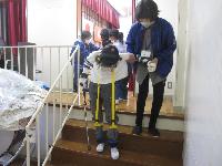 高齢者体験では、足におもりをつけたり、特殊なゴーグルやヘッドフォンをつけたりして身体が自由に動かすことのできない高齢者の方々の状況を体験し、どのような点が不自由なのか、どんなところを介助するとよいかについて知ることができました。
