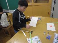 3年生が図工の時間に「トントンくぎ打ち、コンコンビー玉」を作っていました。