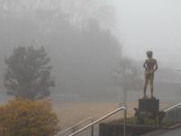 今日、学校に来てみたら、真っ白の霧に包まれていました。こずえさんも、どことなくさみしそうです。まさに「しろいは まっしろ はじまりのまち」ですね。