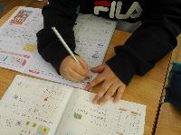 2年生は、書写の硬筆です。みんな、集中して取り組んでいました。無駄口一つありません。ただ、ちょっと見てみると、鉛筆の持ち方が怪しい人が数名います。私はよく「親指姫」という言い方をするのですが、鉛筆を持つときに親指が飛び出る人です。