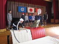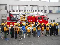 大きなはしご車の前で説明を受け、2班に分かれて、「消防車・救急車」と「消防署」の案内を消防士の方にしてもらいました。素早く出動するためのこつや消防車の装備品など、普段見ることができないものがたくさんありました。一生懸命メモをとっていましたが、あっという間に枠が埋まってしまって困っていました。みんな、とっても勉強熱心でした。