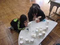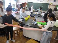 理科室では、静電気の実験で風船を使って、スズランテープを空中に浮か・・・せたいのですが、反対にすぐくっついてしまって、なかなか上手くいきません。何人か上手に浮かせることができました。