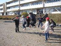 先生から説明を受け、縄の回し方や腕の動きなどを確認、練習してから個々にあや跳びです。
