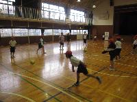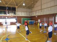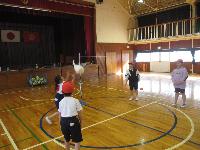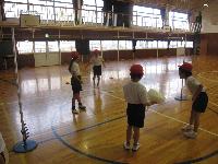 どうやらボールを投げる練習のようです。2年生は、あまり大きなボールを投げた経験がなさそうで「先生、両手で投げてもいいのぉ?」と質問していました。
