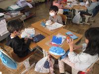 小学校に向かうバスの中で、「先生、手をつないで」というほど緊張していた子もいたそうです。でも、ゲームをしているうちにすっかり打ち解けてきたみたいです。初めて会う私にも気軽に話しかけてくれました。何を見せてくれたのかというと、ゲームを体験した後にもらえる、1年生手作りの折り紙で作ったお土産です。