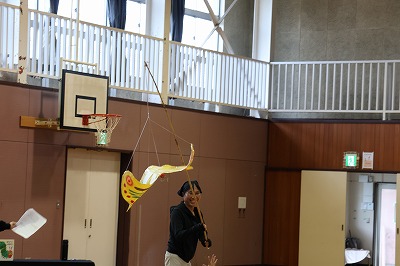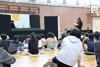 続いて、「おはなしのたまてばこ」の皆さんによる人形劇です。いつもは、教室で絵本などの読み聞かせをしていただいていますが、今日は体育館での人形劇です。大きなセット、生き生きとした人形たちに子どもたちは大興奮でした。