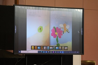 今日は年に一度の図書まつりの日。図書委員が中心となって行いました。最初は、図書委員による絵本の読み聞かせです。大きなテレビに絵本を映し出し、一生懸命に読んでくれました。
