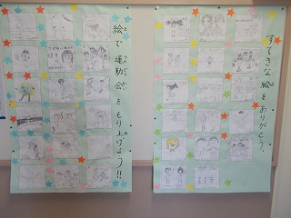 運動会のプログラム用の絵を児童がかきました。プログラムの紙面の都合上掲載できなかった絵を二小っ子ルームの前に掲示しています。どの絵も力作揃いです。