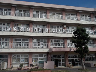 校舎3階のベランダには、運動会のスローガンが掲げられました。明日の運動会、椅子を外へ出すので、脚に土が入り込まないよう、養生テープを貼ります。