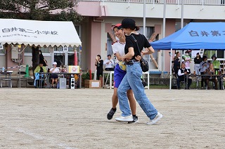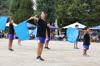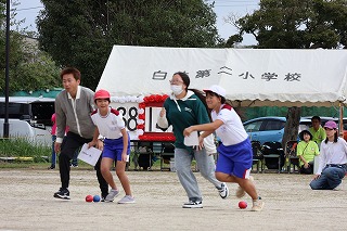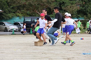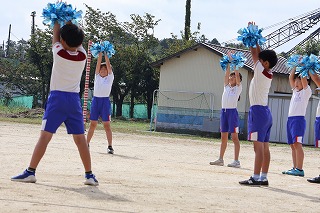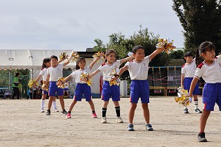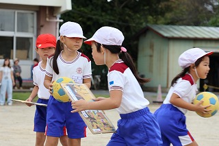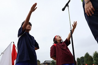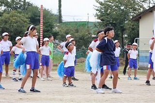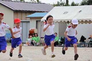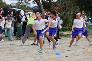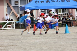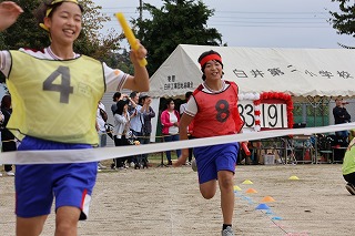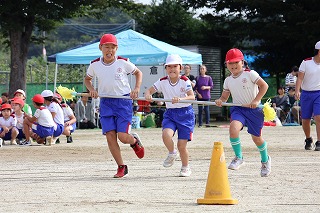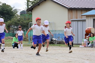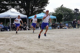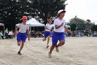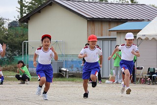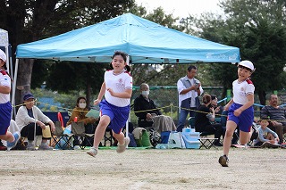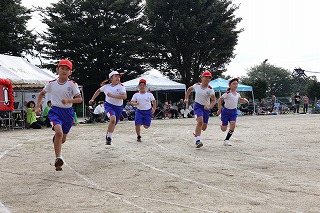 徒競走では、走る前に一人一人呼名されます。全員が全力の返事で応えます。リレーも、全校児童が参加します。小規模校のよさを実感できる運動会でした。