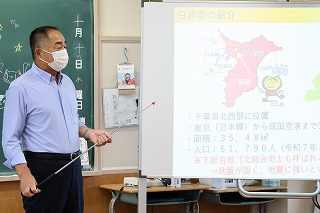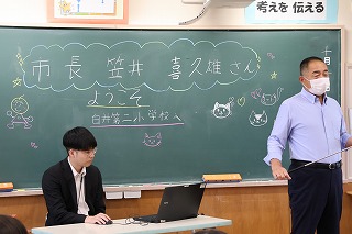 白井市長さんが来校しました。今日は、市長さんによる特別授業の日です。