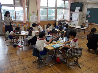 2年生は、国語「さけが大きくなるまで」の初発の感想を発表し合っています。「3メートルもジャンプするなんて、すごいと思いました。」「話を読んで、さけを食べるのがかわいそうになりました。」本校では、教科書教材との関連図書を並行読書します。秋も深まりました。授業をきっかけに、様々な本に手をのばして欲しいです。