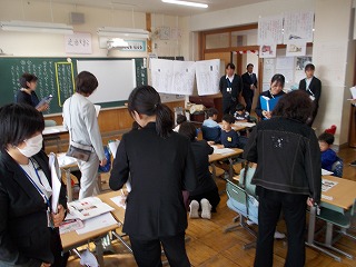 10月になると、すっかり児童と仲良くなっています。休み時間には、一緒にドッジボールをして、始業時には、「算数が始まるよ。席に座って。」と声を掛けていました。図工の時間、どう進めようか迷っている児童にそっと近づき声を掛ける様子は、教員そのものです。