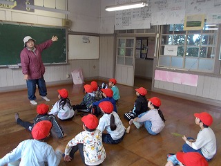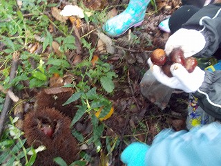ここの地主さんが、たくさんの種類の木の実を拾って欲しいと、苗木を育ててつくってくださった森です。どんぐりの種類によって木が違うこと、そして、その木の皮にも特徴があることなどを、体験しながら学びました。「きのこがある」「虫が動いたよ」「大きな蜘蛛の巣だ」1年生は、どんぐり以外にも、周りの自然に興味津々でした。