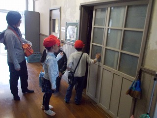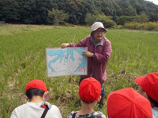 その後、「しろい環境塾」さんのベースキャンプ近くにある田んぼへお邪魔して、稲穂も手に取ってみました。平塚地区の地形についてのお話も聞きました。また、以前本校の分校だった「平塚分校」の校舎の中も見学しました。