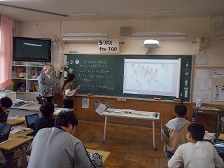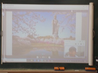 2枚の写真を見せながら、一人4文ずつ紹介します。オンラインで授業に参加していた児童も、同じように発表してました。