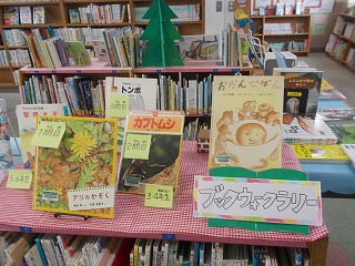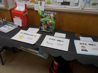 様々な本に手を伸ばすきっかけになればと、図書委員会がブックウォークラリーを開催しています。校舎内を歩いていると、「低学年問題」「中学年問題」「高学年問題」と書かれたファイルが置いてあります。開いてみると、「おだんごぱんは、さいしょだれにあいましたか?」と三択問題が書いています。そして、次にどこの場所へ行けばよいのかの指令も書いています。図書室には、それぞれの問題の元になった本と、最終問題のファイルが置いてあります。クイズを解きながら、本に親しんで欲しいです。