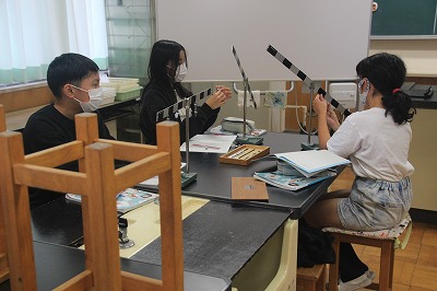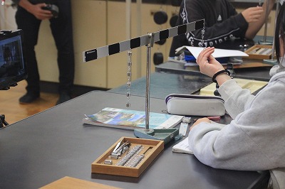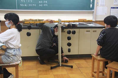 理科室では、6年生が実験をしていました。今日の課題は「てこ」が釣り合う条件を調べることです。
