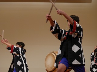本校6年生が、演奏のトップバッターを務めました。全員の息がぴったり合い、太鼓の音が見事に揃います。気迫のある演奏に、「かっこいいー。」と、他校児童が呟いていました。