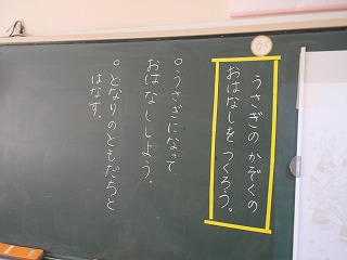 1年生が絵を見ながら考えています。うさぎの家族がテーブルを囲んでいる絵です。うさぎの家族になって、どんなお話をしているのか想像します。