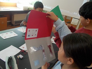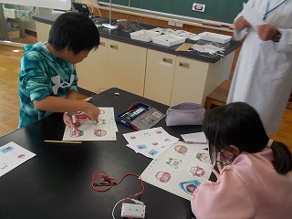 その後は、一人ずつ問題に挑戦します。1枚のシートに6つの顔が描かれています。「誰と誰の口が回路でつながっているのでしょうか。」どの児童も楽しそうに調べています。「これ、お家でも作れそうだね。作ってみたいな。」学習意欲が高まった瞬間です。