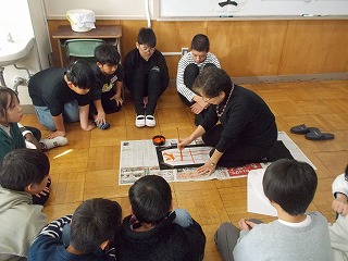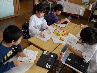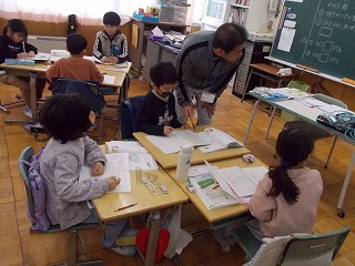 本校で一番人数の少ない6年生。それにしても、教室にいる人数が少なすぎます。教室での学習内容は、「アルトパートを覚えましょう。」と板書にありました。「もしかして、ソプラノパートは音楽室で学習を?」と思って音楽室に向かって行くと、琴の音が聞こえてきました。グループ毎に琴の体験をしています。譜面を指さしたり、番号を読み上げたりして教え合っていました。学級担任は教室で、音楽専科は音楽室で、それぞれが指導しています。それにしても、小規模校ならではです。歌声も琴の音も、一人一人の音がよく聞こえ、きめ細やかな指導ができます。