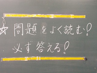 白井市全体の取り組みである、学力総合調査に挑みました。6年生の教室では、黒板に大きな文字で「問題をよく読む!必ず答える!」と書いてあります。春に行った、全国学力学習状況調査で、無回答が無かった学級です。