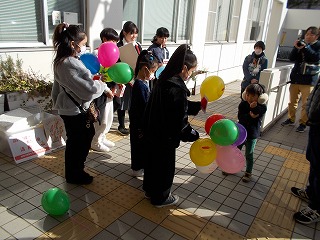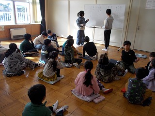 始まる前に、手を引いてトイレに案内する1年生。遊びのコーナーでは、「うまく説明できるかな。」と緊張している様子も見られました。卒園生の児童は、園長先生と懐かしそうにおしゃべりしていました。しかし、会が始まるとすぐに、「いらっしゃい!」と元気な声で呼びかけたり、やさしく教えたりしていました。最後には、1列に並んで行儀よく見送りました。