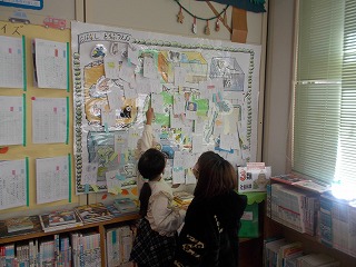 1年生は国語の学習で、動物関連の本を読んで紹介し合うという単元があります。読んでおもしろいと思った本の題名と作者名、出てくる動物の絵をカードにかいて、掲示します。図書室の掲示板には、動物園の絵があり、そこにカードを貼っていきます。カードを見た他の児童が、紹介された本を読んだら付箋を貼っていきます。