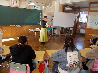 フラッシュカードで単語を確認して、リズムに乗って歌を歌いました。その後、クリスマスに関するゲーム3つの中から児童に選んでもらい、クリスマスバスケットをしました。それぞれの手の中には、黒板に貼っているフラッシュカードと同じ絵が描いている小さなカードを持っています。いつもは元気いっぱいで始まるゲームですが、慣れない英単語の発音に戸惑っている様子です。ALTの番になると、英単語をまとめて3つ話しました。ゲームを楽しむために、どの児童も、英単語を話したり、注意深く聞いたりしています。